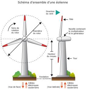 le vent souffle à travers les hélices qui, lorsqu'elles tournent, permettent de produire de l'électricité.