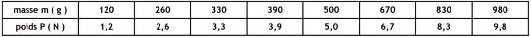 11) Calculez la valeur de g pour un ogjet de masse 330g.