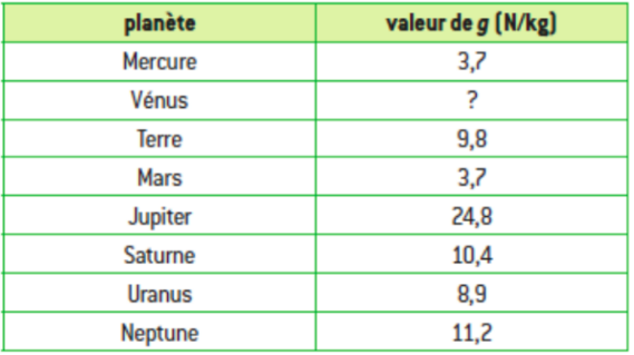 5. Déterminer la valeur de l’intensité de la pesanteur sur Vénus sachant que le poids d’un corps de masse 10 kg est 88 N.