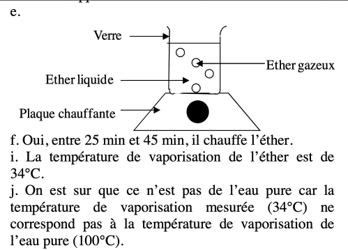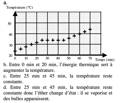 a. On place de l’éther pur (un liquide incolore autre que l’ eau) dans un becher que l’on place sur une plaque chauffante. Toutes les 5 minutes on note la température.