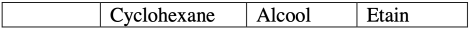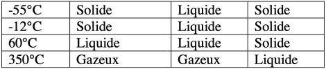 Indique, dans un tableau l'état physique du cyclohexane, de l’alcool et de l’étain aux températures suivantes : -55°C, -12°C, 60°C, 350°C.